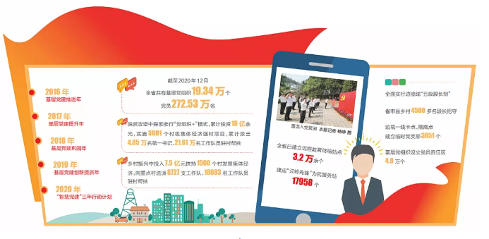 黨的基層組織是黨在社會(huì)基層組織中的戰(zhàn)斗堡壘,是黨的全部工作和戰(zhàn)斗力的基礎(chǔ)。為了讓每名黨員都有力量,每個(gè)黨組織充滿戰(zhàn)斗力,5年來,我省圍繞服務(wù)高質(zhì)量發(fā)展,著力推進(jìn)基層黨建工作理念創(chuàng)新、機(jī)制創(chuàng)新、手段創(chuàng)新,探索形成了“黨支部規(guī)范化建設(shè)”、“萬名黨員進(jìn)黨校”、“雙整百千”四級(jí)聯(lián)創(chuàng)、“智慧黨建”行動(dòng)、“云嶺先鋒”夜校、“黨政軍警民強(qiáng)邊固防工程”等一系列黨建品牌,推動(dòng)全省基層黨建全面進(jìn)步、全面過硬,基層黨組織的戰(zhàn)斗堡壘作用在脫貧攻堅(jiān)、鄉(xiāng)村振興、疫情防控、強(qiáng)邊固防等中心工作中充分彰顯,黨在邊疆民族地區(qū)執(zhí)政的組織基礎(chǔ)得到不斷夯實(shí)。
