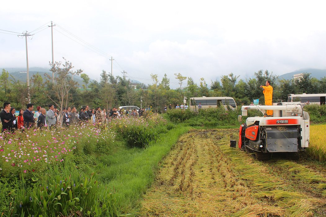 緊接著,全體會員代表又來到位于鳳儀鎮(zhèn)華營的大理州企業(yè)家協(xié)會會員單位——大理榮江生態(tài)農業(yè)發(fā)展有限公司種植基地,現場考察參觀高效生態(tài)的農業(yè)示范基地建設現場,同公司的員工一同共慶第五個農民豐收節(jié)。大理榮江生態(tài)農業(yè)示范基地位于鳳儀鎮(zhèn)華營村,放眼望去,即將收割連片2000多畝的稻田一片金黃,在微風的吹拂下,稻浪翻滾,長勢喜人,蔚為壯觀,一派豐收在望的景象。在考察參觀現場,企業(yè)家們聽取了企業(yè)負責人對生態(tài)農業(yè)示范基地建設、產品市場開拓以及種業(yè)基地打造情況的簡要介紹,并在公司負責人的引領下,沿著田間的機耕道參觀了機械化收割、稻田漁鴨共生現場。