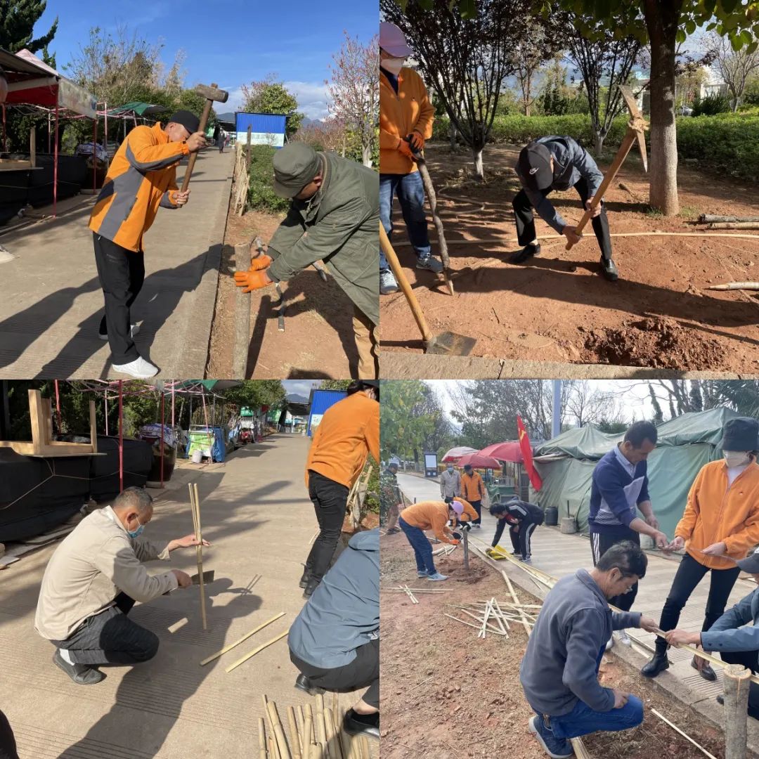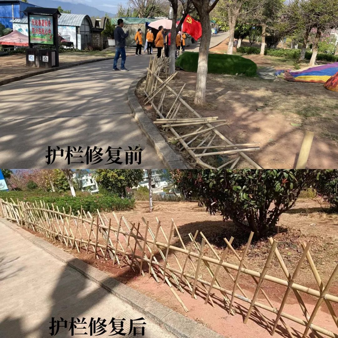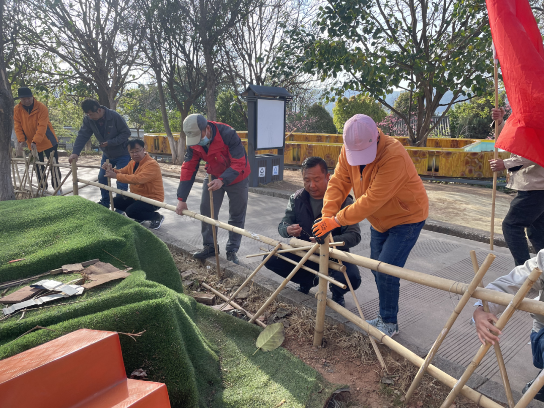 活動(dòng)現(xiàn)場(chǎng),黨旗高高飄揚(yáng),全體黨員熱情高漲,分工明確。你劈竹子、我打木樁、他編網(wǎng),各項(xiàng)工作有條不紊的進(jìn)行著,人人都參與、個(gè)個(gè)動(dòng)手,整個(gè)過(guò)程熱火朝天。最終,經(jīng)過(guò)大家的辛勤勞動(dòng),把竹護(hù)欄修護(hù)如初,有效解決了長(zhǎng)期困擾公園綠化帶邊緣草坪踩踏問(wèn)題,達(dá)到了提升景區(qū)環(huán)境質(zhì)量的目的。